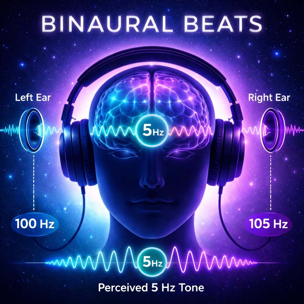 The brain perceives the difference between the tones as a gentle rhythmic pulse, which may encourage the mind to settle into slower brainwave patterns associated with relaxation, meditation, and sleep.